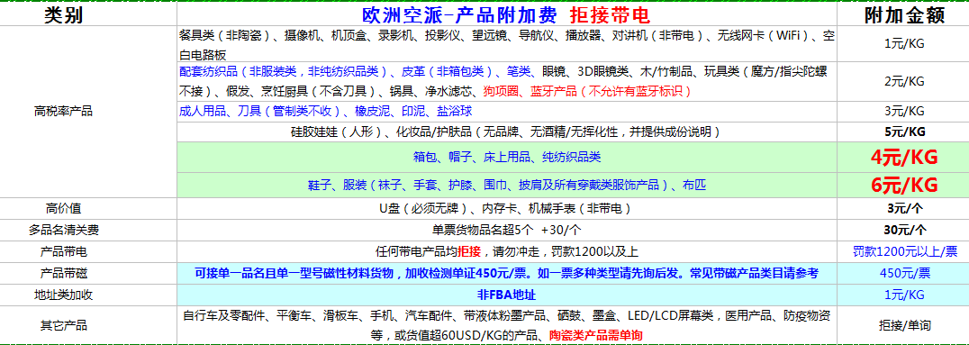 (1.产品附加:鉴于出口运输有特定要求及国外进口高税费的部份产品类目(下表所示),在运费基础上进行额外加收,所列产品附加费不需叠加,取高为准!(带磁/带电类,请注意其它要求及加收!)