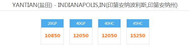 YANTIAN(盐田) - INDIANAPOLIS,IN(印第安纳波利斯,印第安纳州)整柜海运费美国门到门