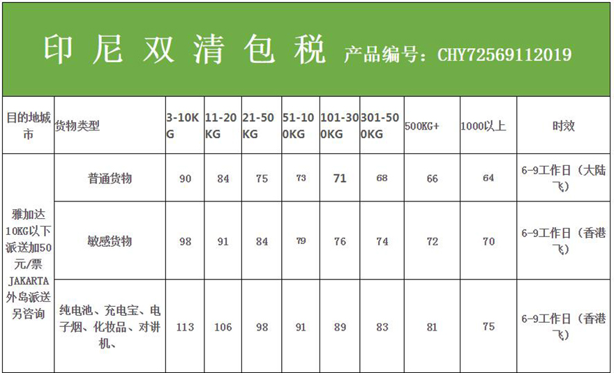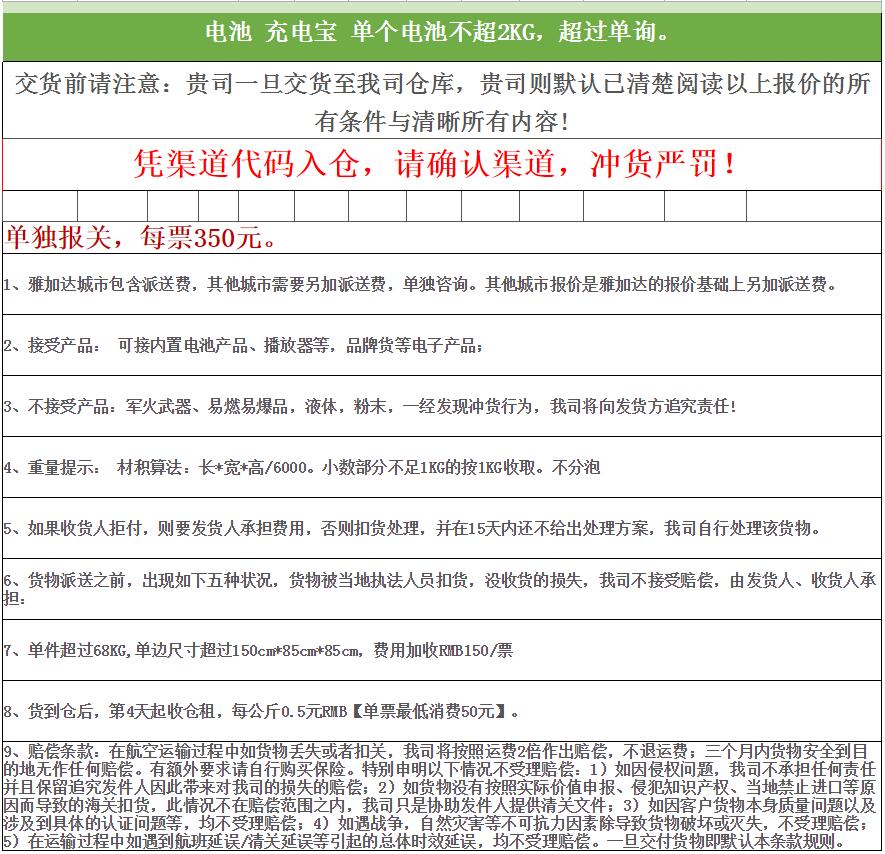 运费说明 | 报价含空运费,文件费,印尼清关费,比例为1:200,最低起运1KG;单件超过68KG或单边尺寸超过150cm*85cm*85cm,费用加收RMB150/票;不含海关查验产生的任何费用。 |